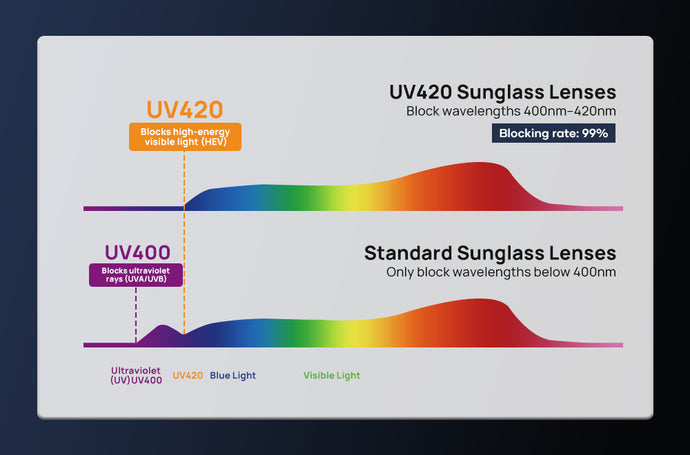 UV420 Protection blocks 100% UVA/UVB rays and 400-420nm HEV light, surpassing UV400 lenses. It provides full protection against ultraviolet and harmful blue-violet light, ideal for extreme sunlight. Thermo-resistant technology ensures performance up to 420mm wavelength.